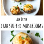 Air Fryer Stuffed Mushrooms with Crab and cheese are easy to make and always a crowd pleaser. And the best part is, you can make these bite sized air fryer appetizers ahead of time, ready to pop into the air fryer when guests arrive.