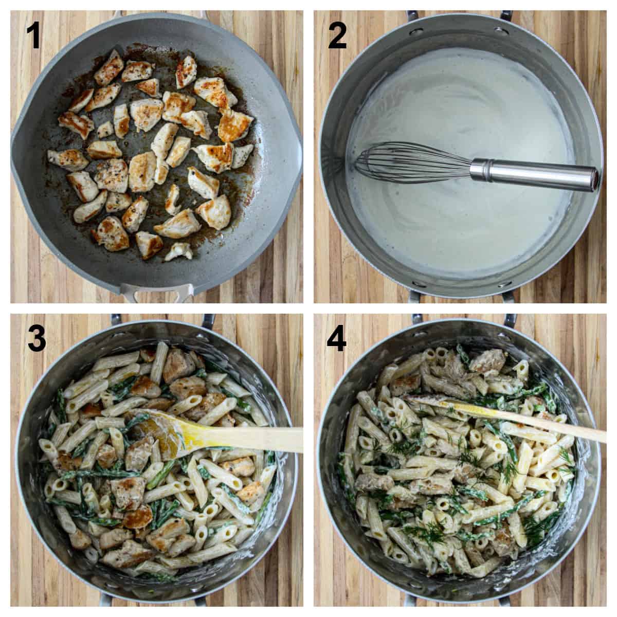 - Cook the pasta in a large pot of boiling water according to the package instructions. Add the asparagus to the pasta pot for the last few minutes of cooking time. Heat the oil over medium-high heat in a large skillet. Season and sauté chicken until golden brown and cooked through, then set aside.