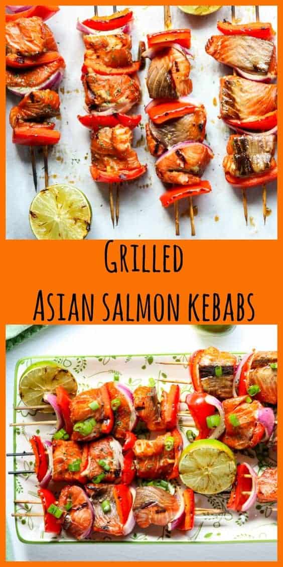 Serve these grilled Asian salmon kebabs with rice, or with a seasonal summer salad, like Tomato Peach Salad, or Cucumber Melon Salad. You can slather the kebabs with Honey Teriyaki Sauce or serve them with Homemade Tartar Sauce on the side. And for more ways to cook salmon, check out Teriyaki Salmon Stir Fry or Air Fryer Salmon.