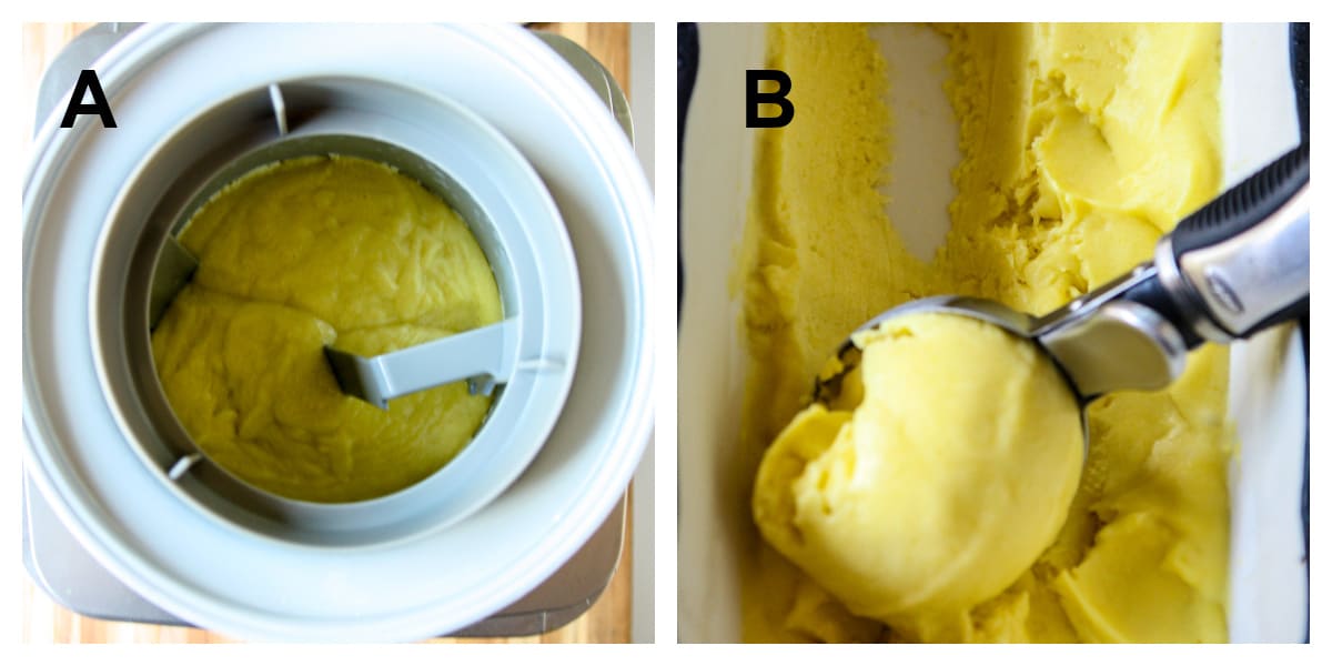 - Pour the mango mixture into the bowl of an ice cream maker and process about 40 minutes for a soft serve consistency.
